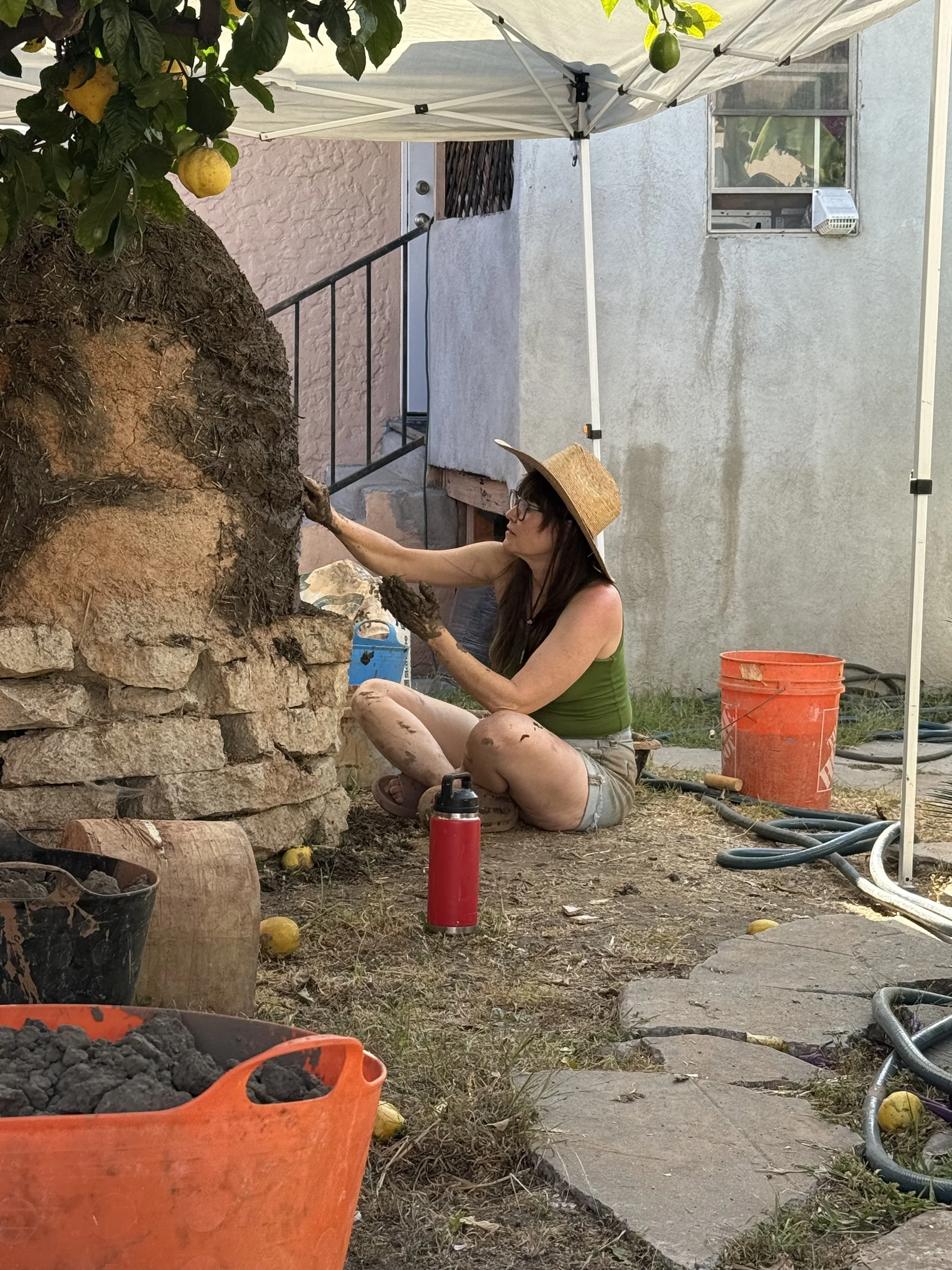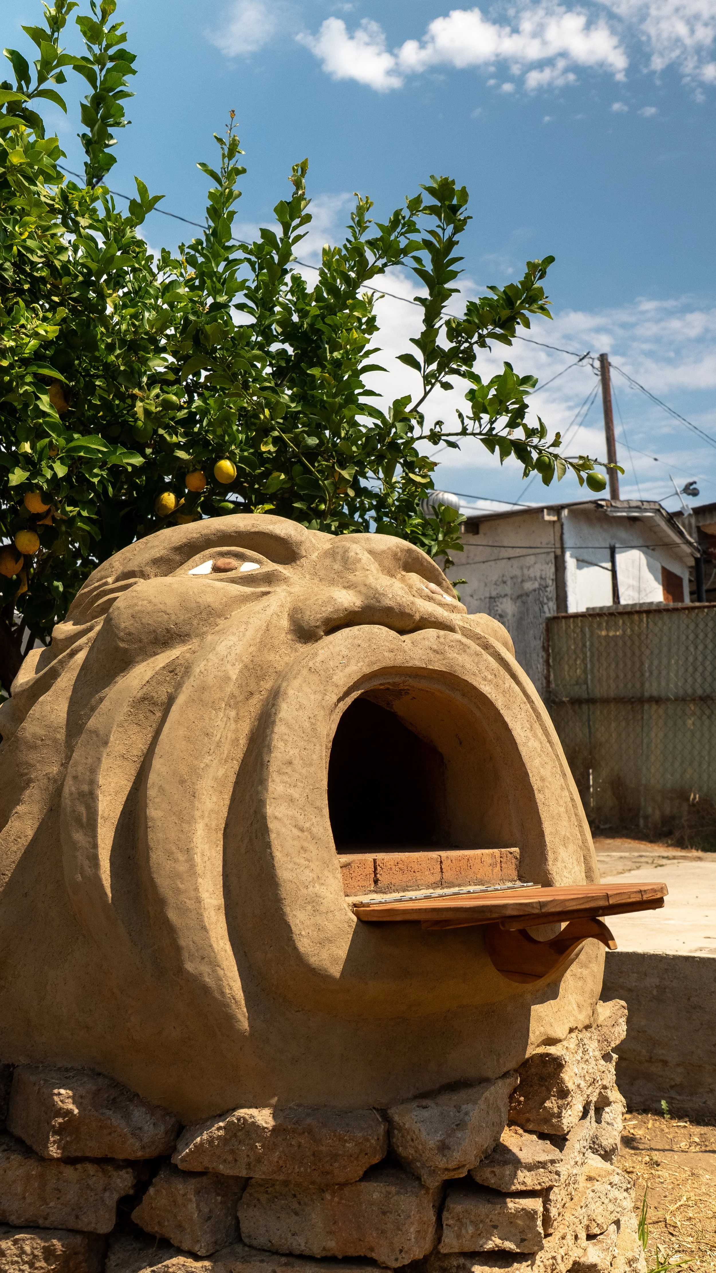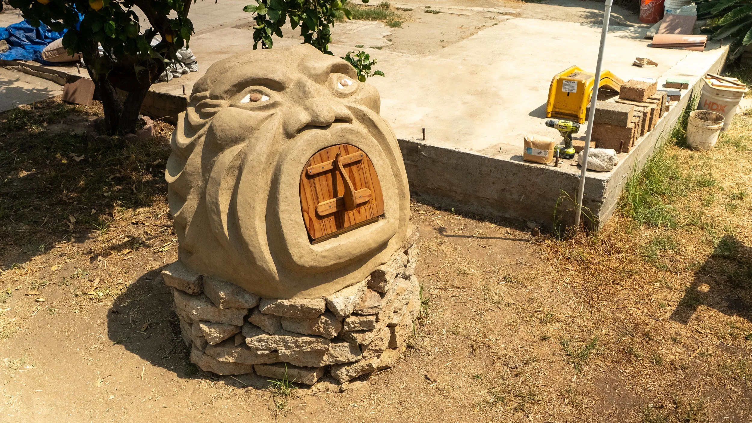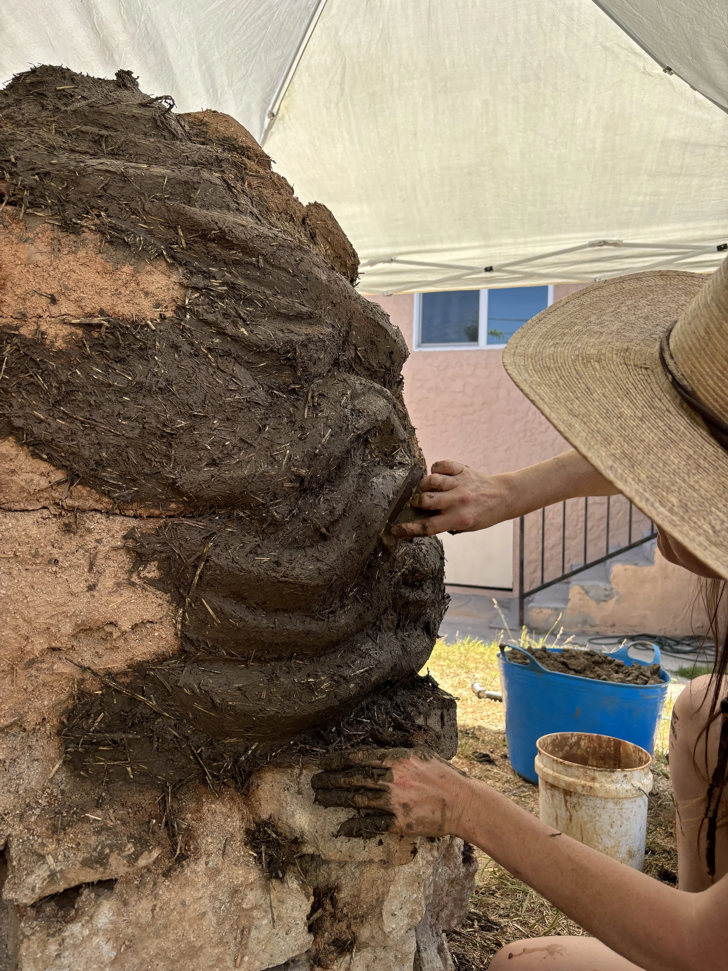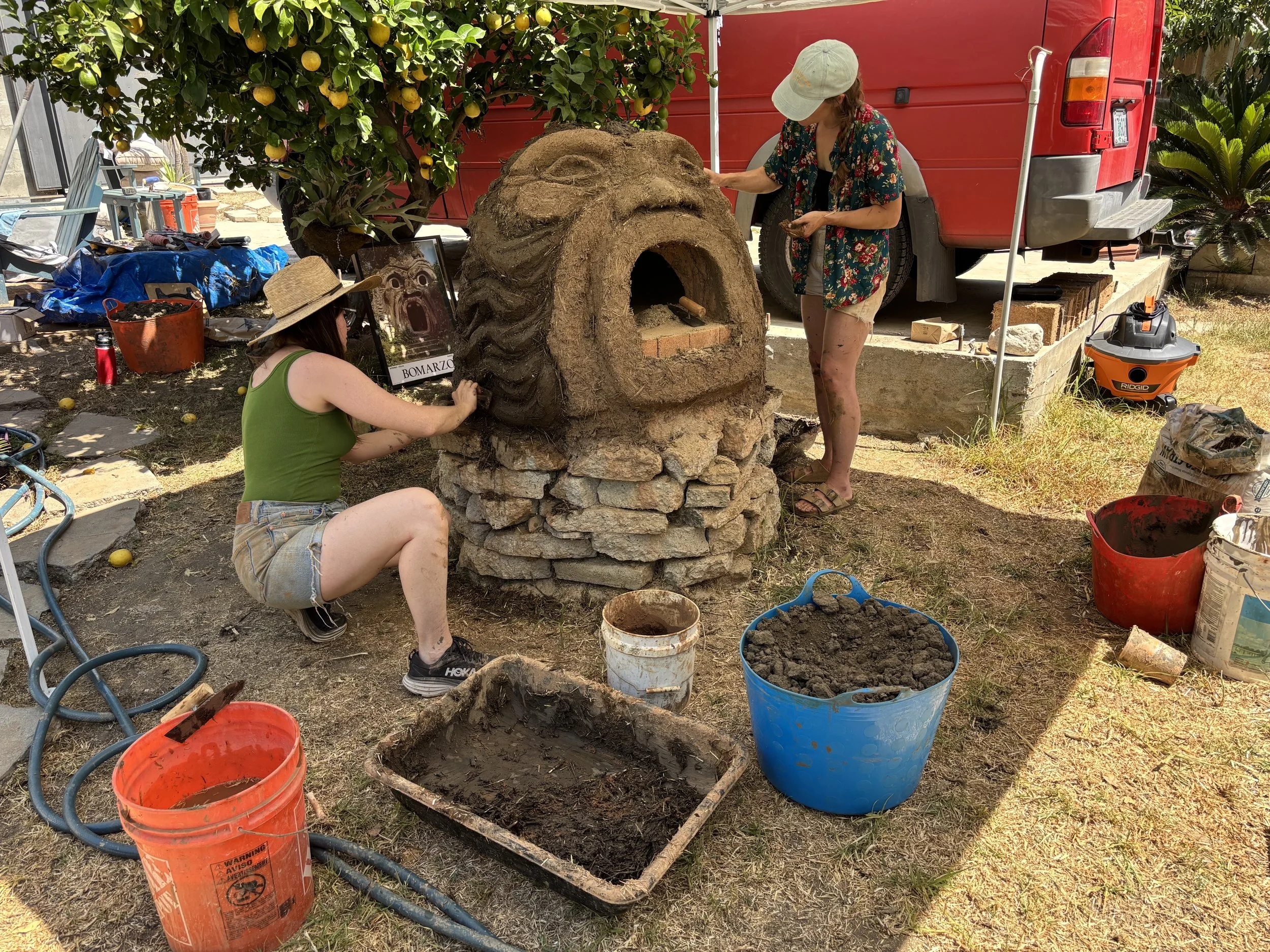 As much as we love simple modern curves, we couldn’t resist the sculptural opportunity on this oven. Erin’s affinity for folk art and sculptural gardens led us to making our own version of the grief stricken sculptures found in Bomarzo, Italy. Originally expressing the pain of a lost love, our rendition channels the general grief, frustration, and helplessness that comes with watching the daily horrors on a little pocket screen. Giving those feelings a physical shape can move them through the body. We are big believers in the power of art and clay as a healthy way to process, a meditation. In this case, we created a functional sculpture that will bring people together around food and conversation, the most basic form of community building. May we work toward collective liberation through even our smallest acts.
